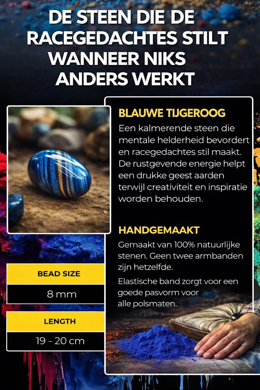 De armband is geen medisch hulpmiddel en vervangt geen behandeling. Wat hij wél doet, is functioneren als een fysiek anker. Veel klanten ervaren dat de combinatie van Blue Tiger’s Eye en het bewust aanraken van de kralen helpt om mentale onrust te verminderen en sneller terug te keren naar focus. Het effect verschilt per persoon, maar velen beschrijven het als subtiele, ondersteunende rust.