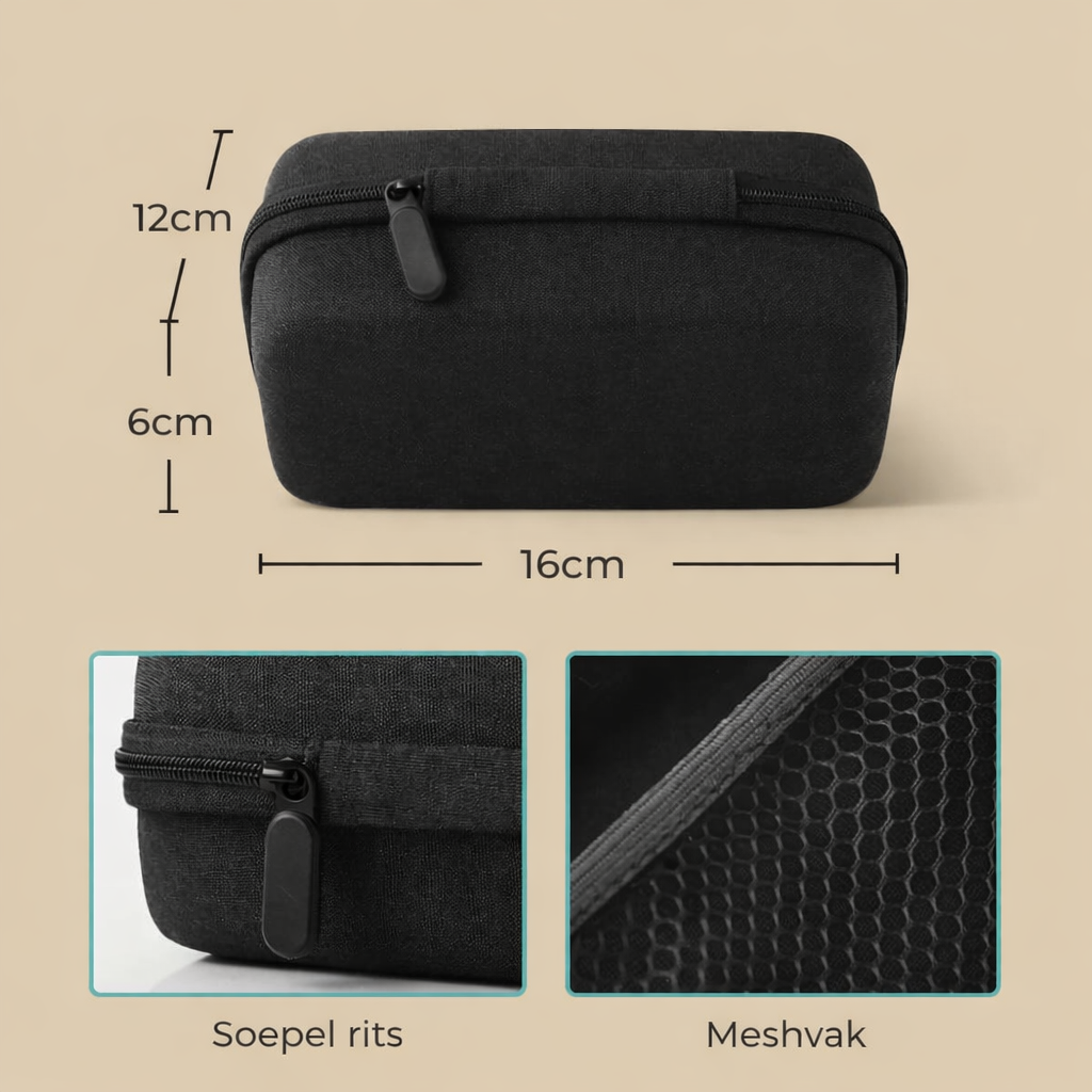 Gemaakt van sterk en hard EVA-materiaal is deze koffertje half-waterdicht, schokbestendig en stofvrij, en biedt zo uitstekende bescherming voor je Ademmaatje vernevelaar en accessoires. De ruime binnenkant biedt genoeg ruimte voor je apparaat, terwijl het handige netvak aan de bovenkant je in staat stelt om je astmamedicijnen, alcoholdoekjes en andere belangrijke spullen veilig op te bergen.