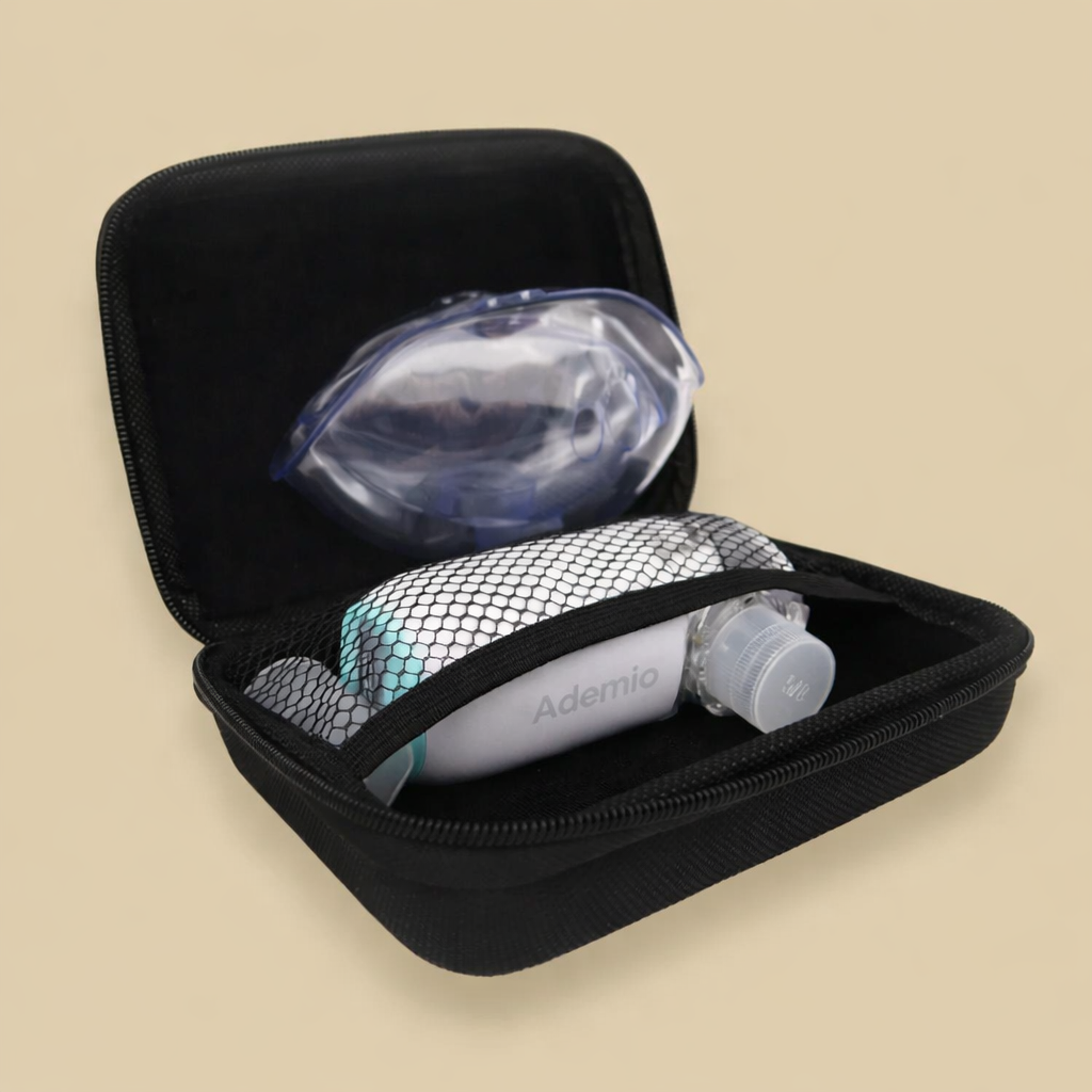 Maak kennis met het perfecte etui om je Ademio® vernevelaar en andere ademhalingsbenodigdheden veilig en overzichtelijk te houden! Deze stijlvolle en stevige koffertje is een absolute must-have voor iedereen die zijn inhalators, medicijnen, spacers, maskers en meer onderweg wil beschermen.