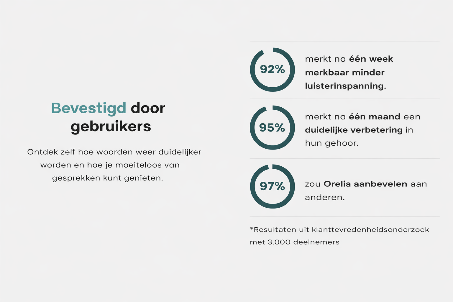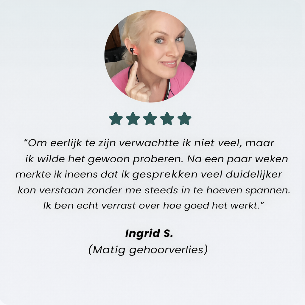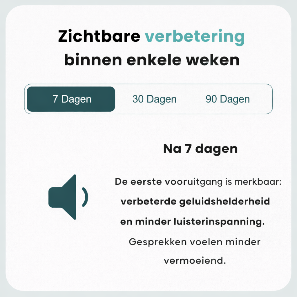 92% van de gebruikers meldt merkbare verbeteringen binnen de eerste week. De eerste vooruitgang is zichtbaar in een duidelijkere geluidswaarneming en minder luistervermoeidheid. Na 30 dagen bereiken velen een voldoende gehoor zonder hoortoestel en vinden ze het gemakkelijker om gesprekken te voeren in kleine groepen. Na 90 dagen is het gehoor bij de meeste gebruikers bijna volledig hersteld en zijn tinnitusklachten met tot wel 95% verminderd.