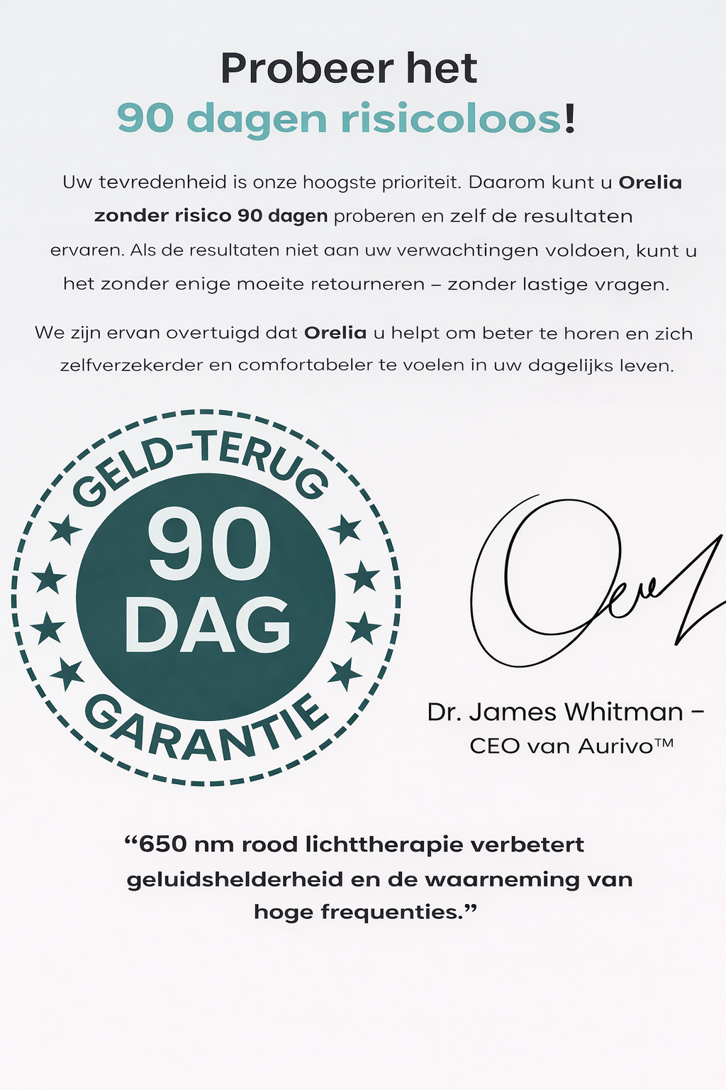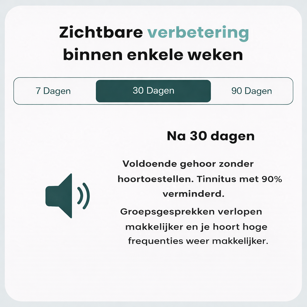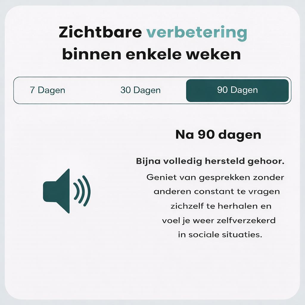 92% van de gebruikers meldt merkbare verbeteringen binnen de eerste week. De eerste vooruitgang is zichtbaar in een helderdere geluidswaarneming en minder luistervermoeidheid. Na 30 dagen bereiken velen een voldoende gehoor zonder gehoorapparaat en vinden ze het gemakkelijker om gesprekken in kleine groepen te voeren. Na 90 dagen is het gehoor bij de meeste gebruikers bijna volledig hersteld en zijn tinnitusklachten tot wel 95% verminderd.