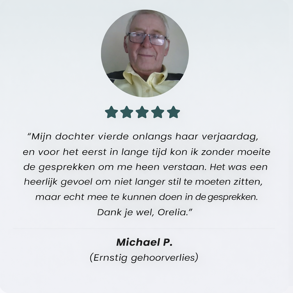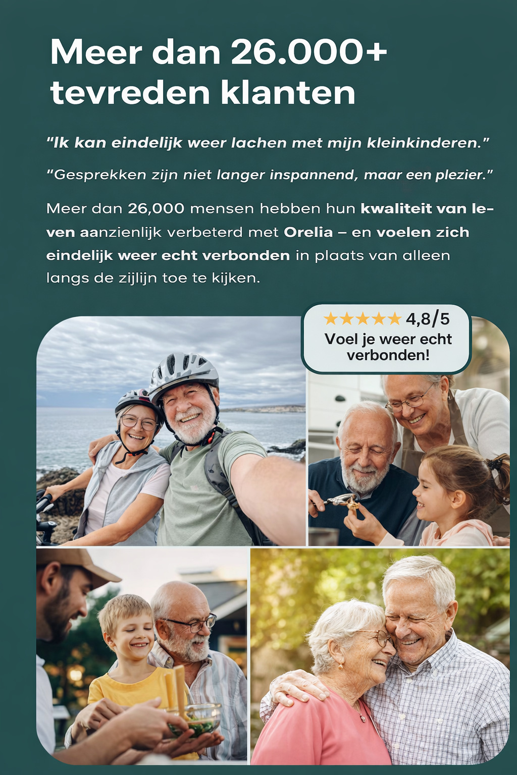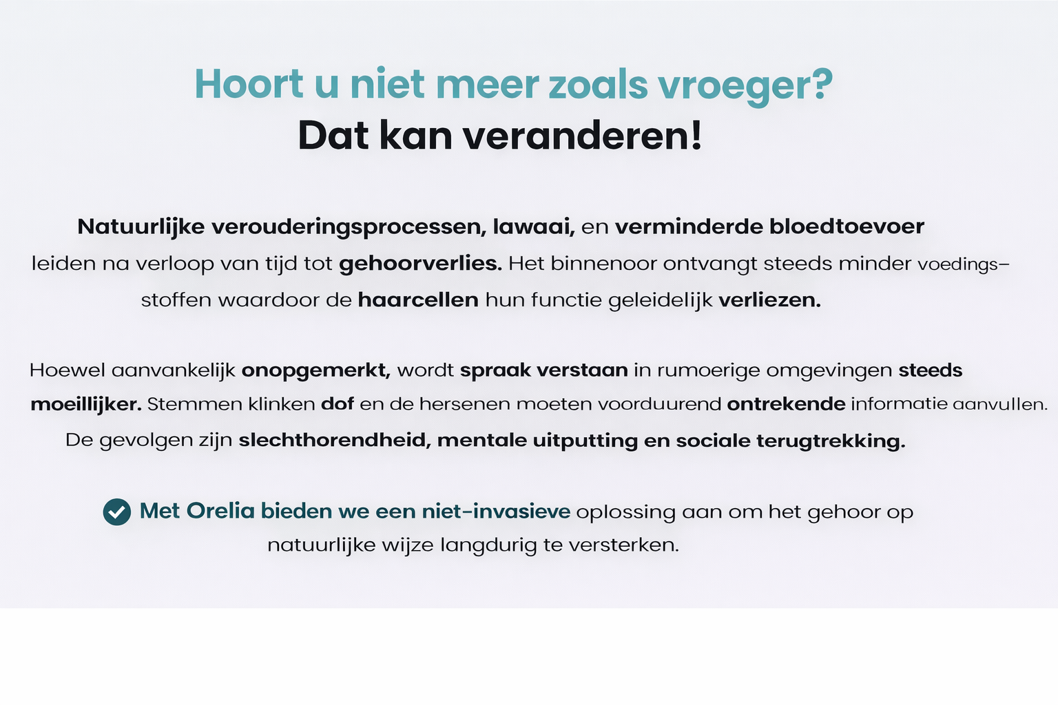 Orelia is een natuurlijke en langdurige oplossing. In het begin kunnen gehoorapparaten nog in het dagelijks leven worden gebruikt, omdat de therapie enkele weken nodig heeft om merkbaar effect te hebben. Veel mensen geven echter aan dat ze na vier weken minder afhankelijk zijn en het op lange termijn volledig zonder kunnen.