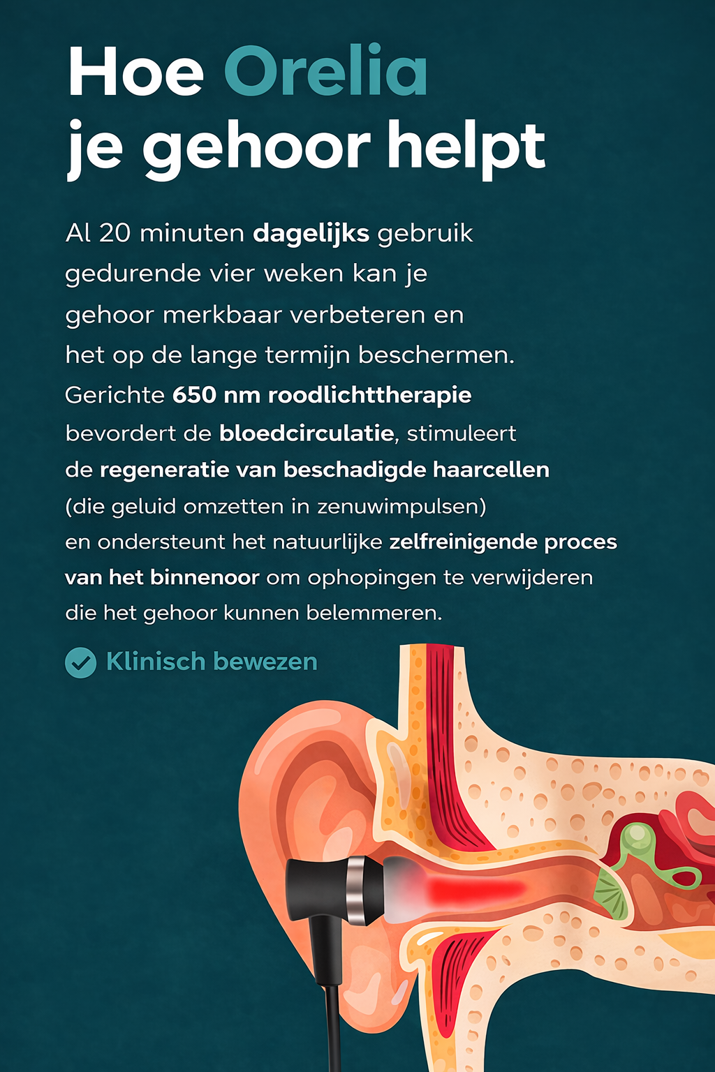 Orelia maken gebruik van gerichte 650 nm roodlichttherapie om de regeneratie van beschadigde haarcellen in het slakkenhuis te ondersteunen. Deze cellen zijn verantwoordelijk voor het omzetten van geluid in zenuwimpulsen en zijn essentieel voor een goed gehoor. Tegelijkertijd wordt de bloedcirculatie in het binnenoor gestimuleerd, waardoor het optimaal wordt voorzien van voedingsstoffen. Dit kan het gehoor op lange termijn versterken en het spraakverstaan herstellen.
