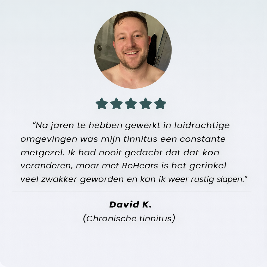 Ja, ReHears kan ook tegen tinnitus worden gebruikt. Veel gebruikers melden dat hun tinnitus na een paar weken aanzienlijk zwakker werd en in de meeste gevallen na 90 dagen bijna volledig verdween.