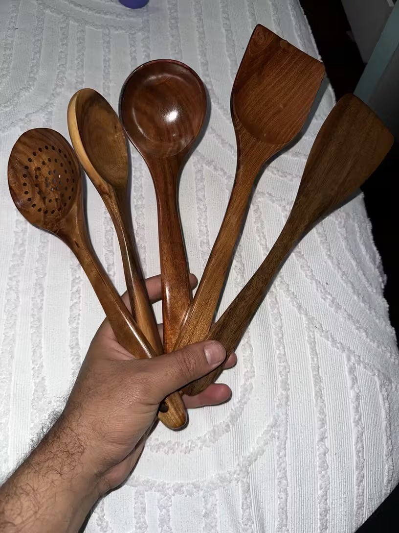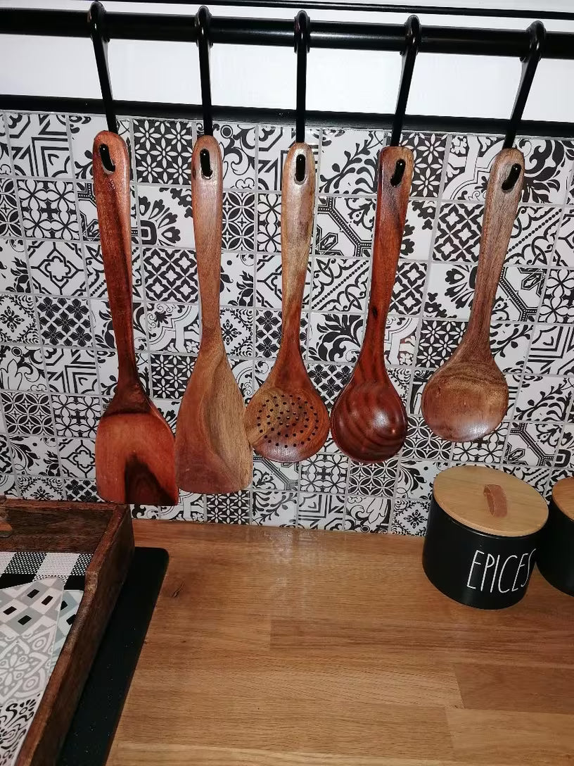 Deze complete keukenset - met pollepel, spatel en roerlepel - is gemaakt van hout. Daardoor zijn je antiaanbakpannen veilig voor krassen, en voelt het koken weer ambachtelijk en organisch aan. Hout zorgt voor warmte, karakter en tijdloze elegantie.
